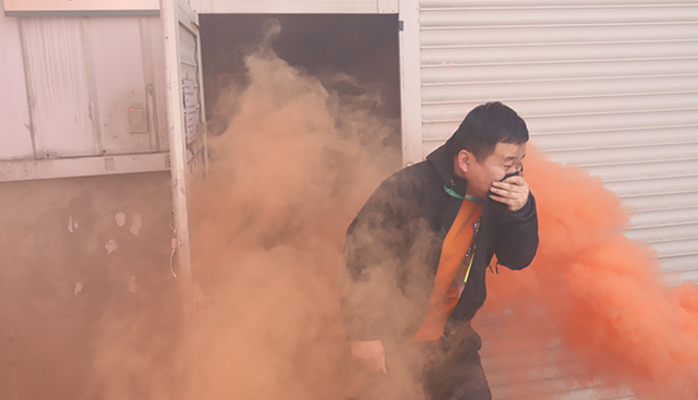 員工手捂口鼻低頭彎腰井然有序逃離火災現場