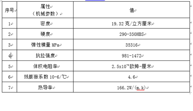 碳化鎢的熔點為℃ 3410,密度g/cm3 19.32,熱導率W/(m·K) 166.2,線膨脹系數10-6/℃ 4.6,彈性模量MPa 35316,硬度HBS 290350,抗拉強度MPa 9811472,伸長率% 35。