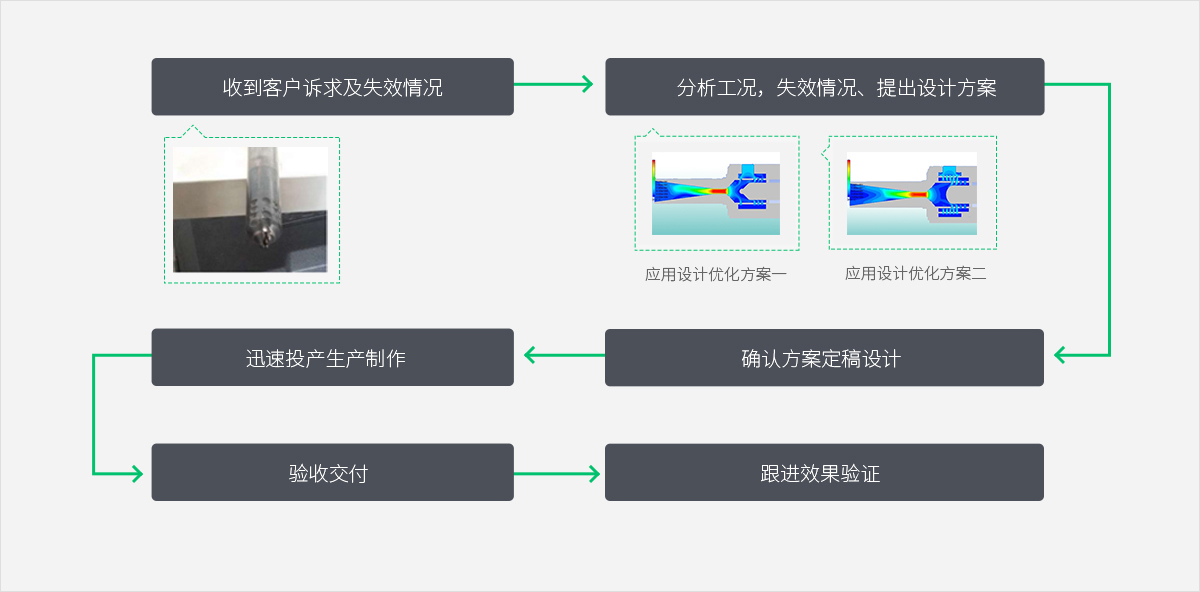 收到客戶訴求及失效情況 → 分析工況,失效情況、提出設計方案 → 應用設計優化方案 → 確認方案定稿設計 → 迅速投產生產制作 → 驗收交付 → 跟進效果驗證