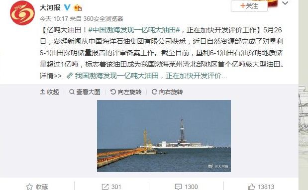 油氣勘探重大發現 渤海發現1億噸大油田