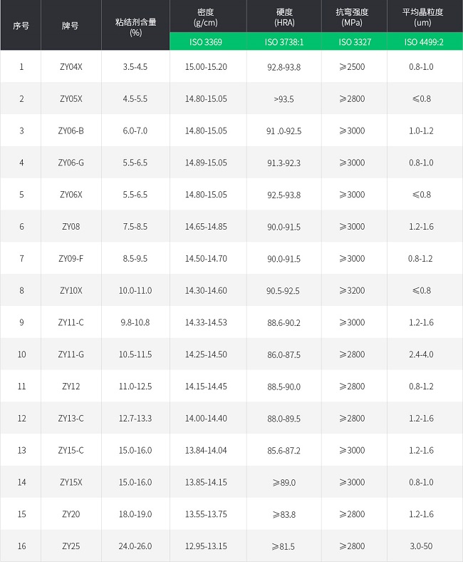 鎢鈷硬質(zhì)合金是由碳化鎢和金屬鈷組成的硬質(zhì)合金,這類合金是產(chǎn)量最大、用途最廣的一類。西迪技術(shù)股份有限公司硬質(zhì)合金牌號中也以鎢鈷類硬質(zhì)合金占比最多。其詳細(xì)性能可通過下面的牌號表可以看出,供客戶不同需求做選擇參考。