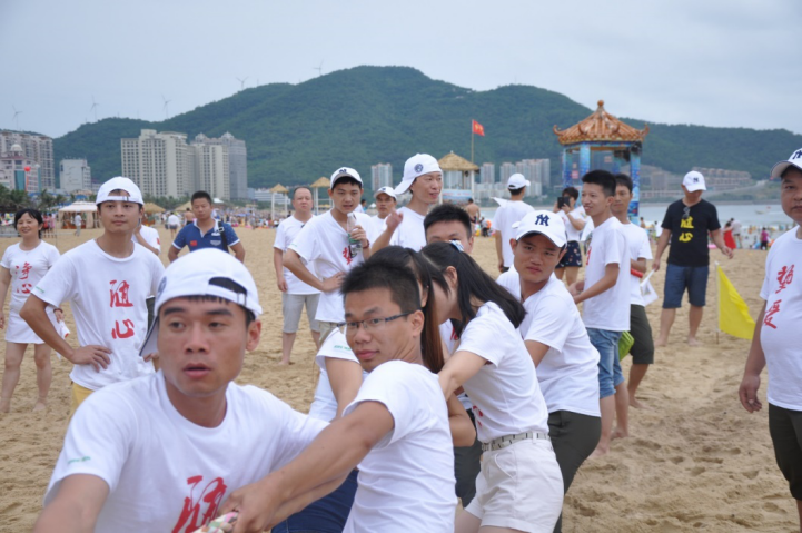 拔河比賽是適合團隊培養凝聚力的活動,在細膩柔軟的沙灘上,有碧海藍天做背景,是不是更適合拔河,我們要更拼出我們的團結我們的力量來,不能辜負海陵島這美麗的海景??!